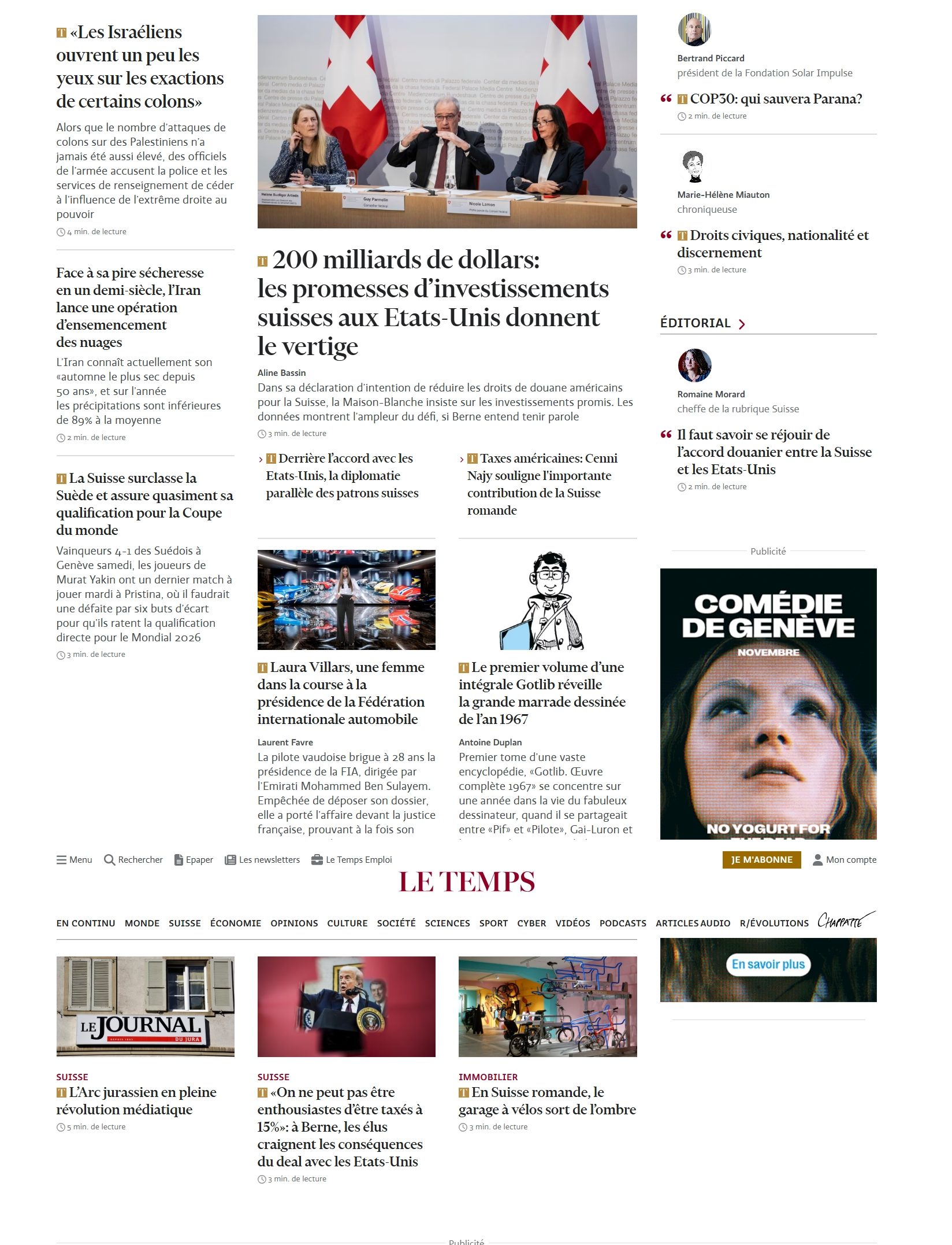 Le Temps 是瑞士的一家主要法语新闻机构,提供国内外的深度报道、分析与评论。其内容覆盖了政治、经济、文化、科技、社会等多个领域,特别注重时事新闻的深度分析与解读。作为一个综合性新闻网站,Le Temps 突出了国际视野与瑞士本土新闻的结合,受到了高端用户群体的喜爱。该网站致力于提供及时、权威的信息和专业的新闻报道。