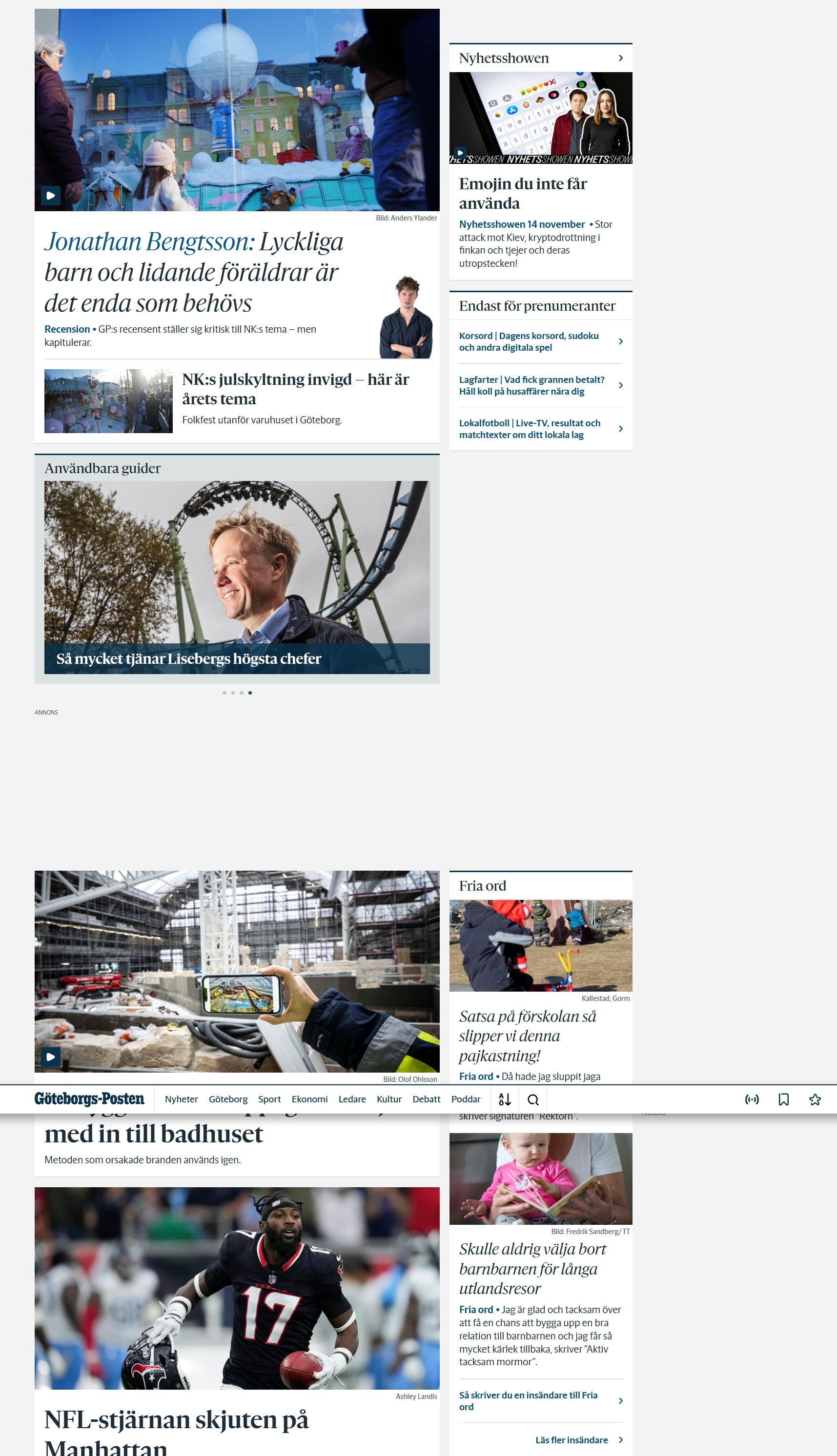 该网站是瑞典新闻网站《Göteborgs-Posten》(简称GP)的主页,提供关于瑞典及国际新闻的即时报道,涵盖政治、社会、经济、娱乐、体育等多个领域。网站的内容设计简洁,快速加载新闻,用户可以迅速了解最新的新闻头条和重要事件。它是一个综合性强、面向广泛受众的新闻平台,针对瑞典国内以及国际发生的重要新闻进行详细报道。