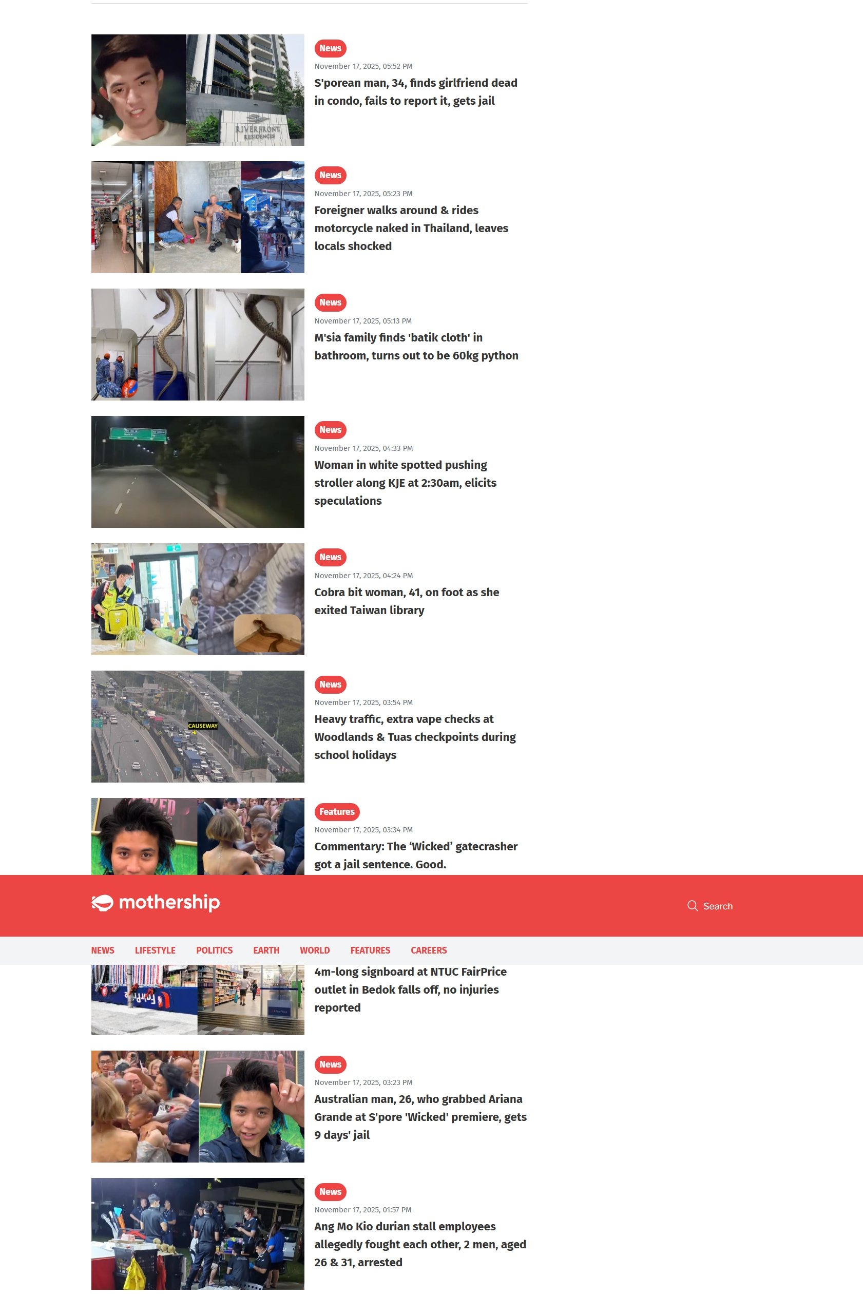 Mothership.sg 是新加坡的一个本地新闻平台,旨在提供新加坡本地新闻、社会热点、娱乐事件以及轻松幽默的内容。该网站凭借其即时新闻更新、深入的社会议题探讨以及富有创意的内容形式,成为新加坡年轻人和互联网用户的重要信息来源。网站内容不仅涵盖时事新闻,还包含视频、专栏、社交互动内容等,旨在为用户提供快速、有趣且多元化的新闻体验。