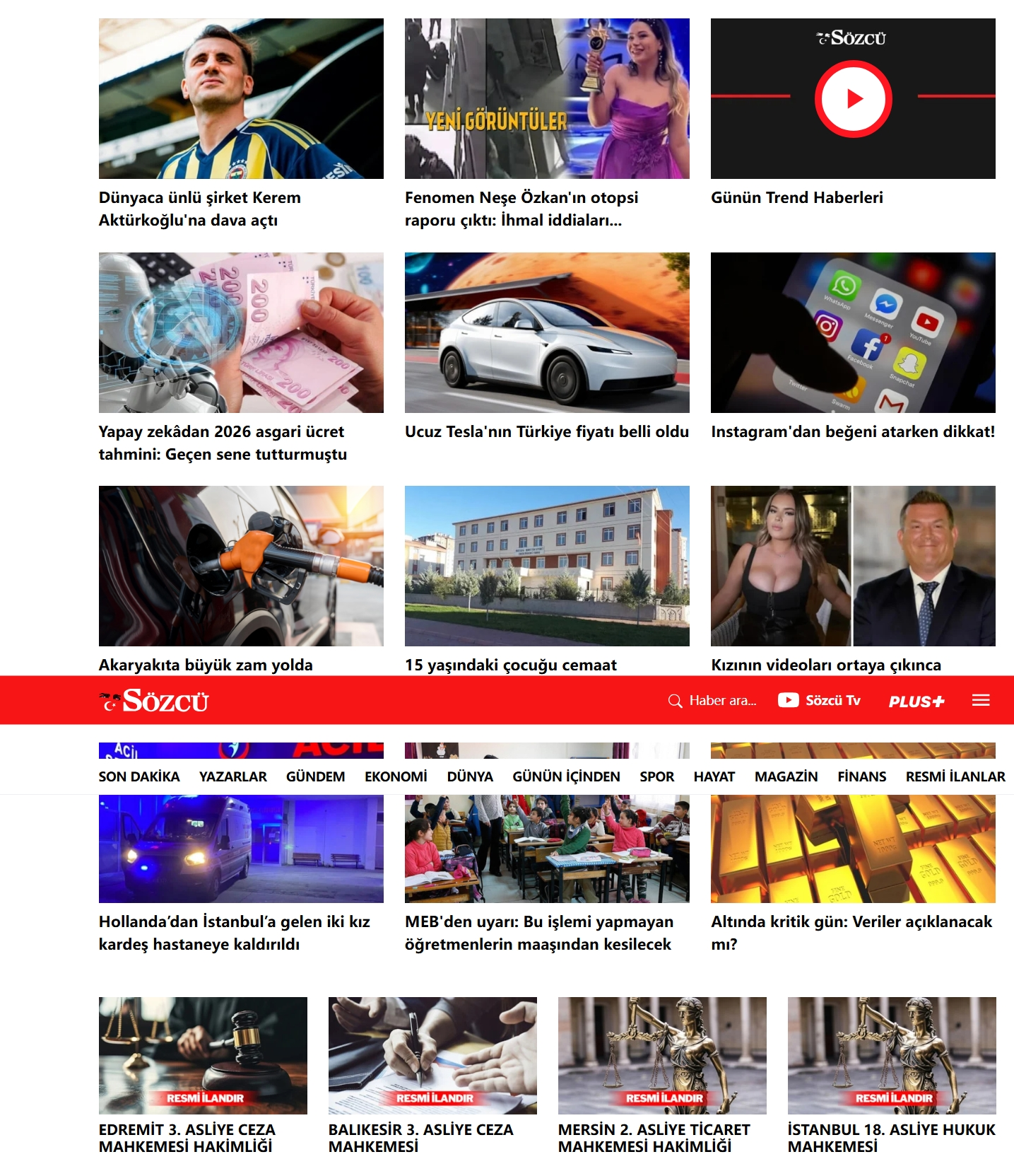 Sozcu.com.tr 是土耳其知名度极高、信息密度强且具有鲜明媒体立场的综合新闻门户。首页以强烈的红色视觉主调构建新闻媒体的紧迫感,头部大版块集中展示突发消息、政治焦点与社会热点,透过醒目的标题和大幅图片吸引用户注意。其下布局采用多板块串联方式,将政治、世界、经济、体育、科技、生活方式等资讯以图文卡片呈现,搭配深色背景区块突出重点专题。