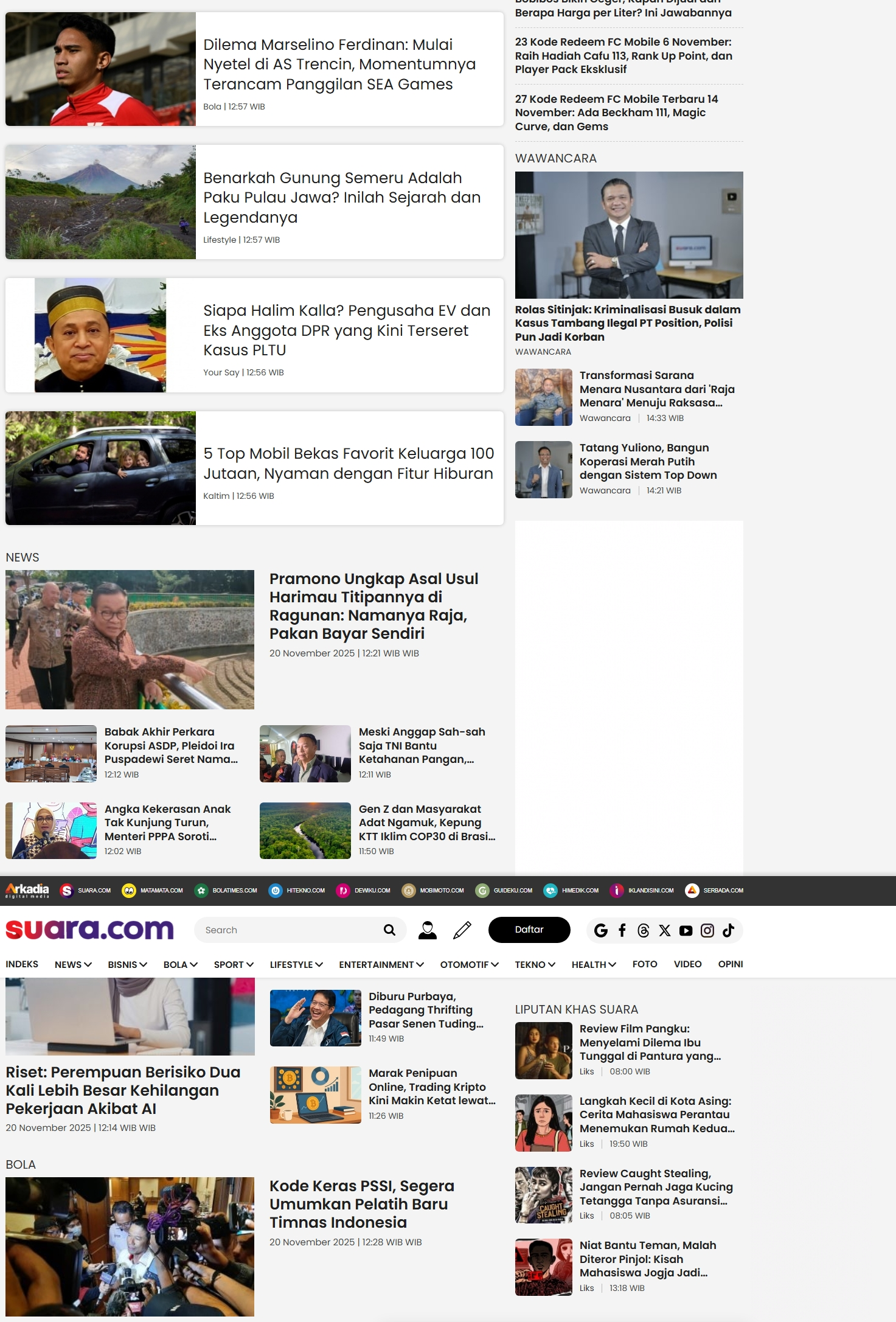 Suara.com 是印尼流量极高的综合新闻与娱乐内容平台,首页版面以“热点聚合 + 多分类并行更新”为核心设计,呈现出极为丰富的资讯密度。页面顶部展示热门频道导航,涵盖 nasional、bisnis、bola、lifestyle、entertainment 等常见类别,并搭配 Trending 热议标签,让用户第一时间聚焦当前讨论度最高的主题。首页头部大图区以娱乐、社会热点与突发新闻为主,其下快速延伸出多条图文混合的资讯流,覆盖社会、明星、地方新闻、生活方式、科技、政治等多领域内容。