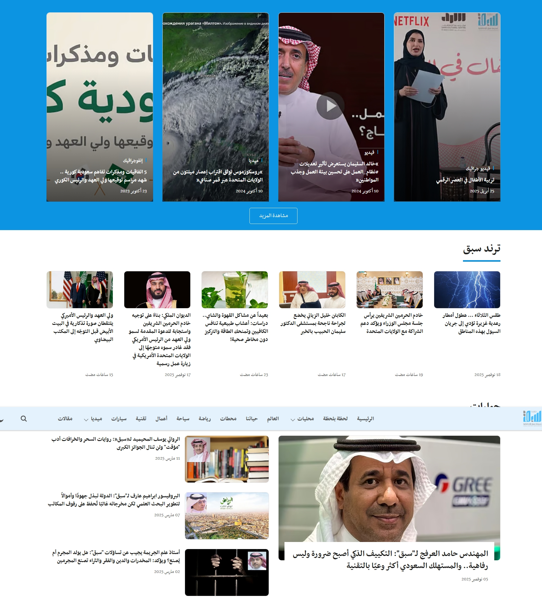 Sabq.org 是沙特阿拉伯极具影响力的在线新闻门户,以其快速更新、贴近民生、兼具官方与社会视角的报道特色在阿拉伯地区拥有庞大受众。网站首页以大幅焦点新闻开场,配合多栏式的新闻排列,将政治、社会、经济、科技、体育以及区域发展等内容分门别类呈现。整体版面以极为整洁的白色及浅蓝色背景构成,营造严肃且现代的新闻阅读氛围。内容更新频率极高,几乎实时捕捉沙特国内要闻、政府声明、国际外交往来、重大社会事件及城市生活动态,是典型面向大众且具权威性的“综合型新闻站点”。