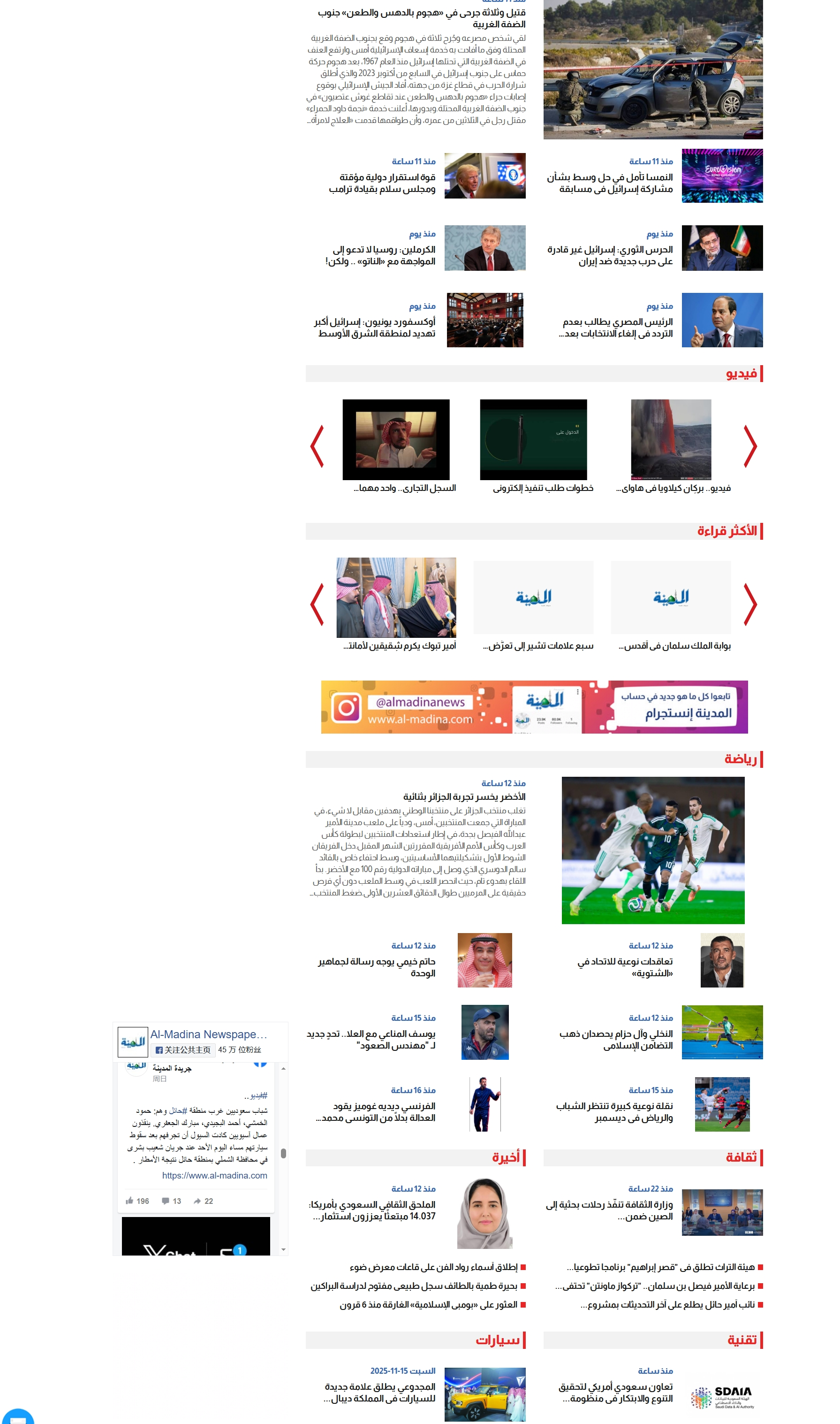 Al-Madina(麦地那报)官方网站是一家深具历史底蕴的沙特阿拉伯综合新闻媒体平台,整体风格以“简洁白底 + 明确分类”呈现,强调新闻阅读的快速性与直达性。网站首页顶部以大型焦点新闻图横幅展示政治要闻,特别突出涉及沙特外交、国际关系与国家战略重点的内容。布局采用多板块分区形式,自上而下分层展示“头条精选、城市新闻、国际动态、经济板块、娱乐、体育、文化及特色副栏目”,以图片配文字的方式呈现大量新闻节点,使整站信息密集却不杂乱,体现传统报纸向数字化媒体转型后的整合能力。