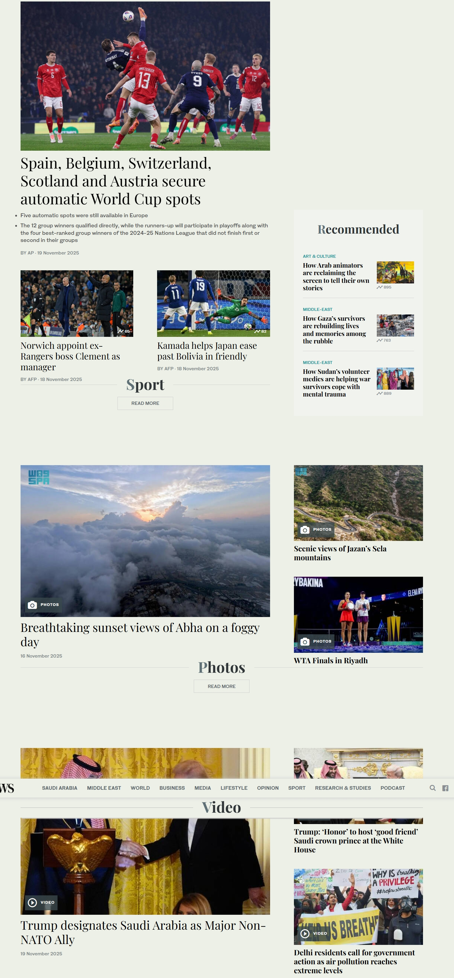 Al-Madina(麦地那报)官方网站是一家深具历史底蕴的沙特阿拉伯综合新闻媒体平台,整体风格以“简洁白底 + 明确分类”呈现,强调新闻阅读的快速性与直达性。网站首页顶部以大型焦点新闻图横幅展示政治要闻,特别突出涉及沙特外交、国际关系与国家战略重点的内容。布局采用多板块分区形式,自上而下分层展示“头条精选、城市新闻、国际动态、经济板块、娱乐、体育、文化及特色副栏目”,以图片配文字的方式呈现大量新闻节点,使整站信息密集却不杂乱,体现传统报纸向数字化媒体转型后的整合能力。