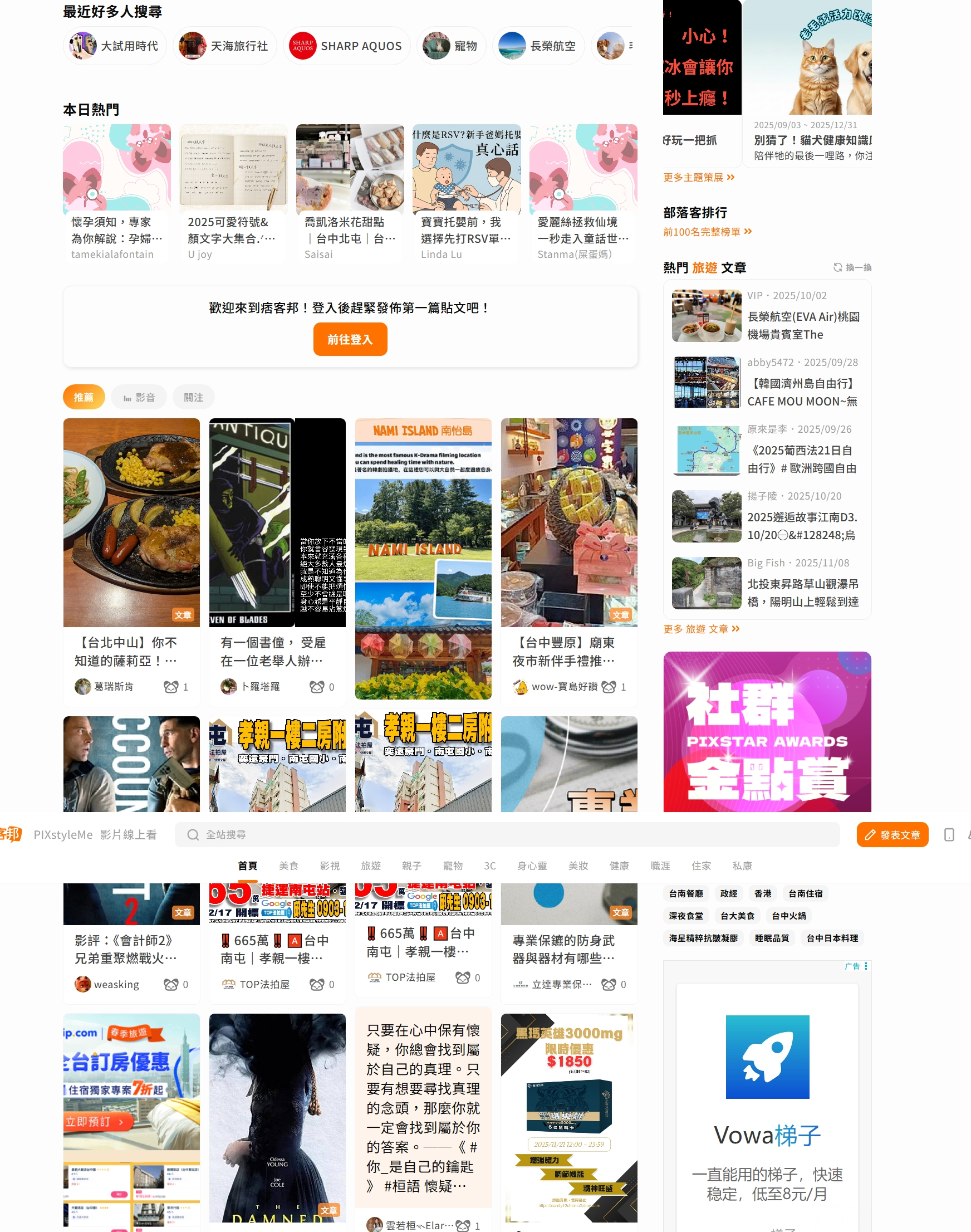 Pixnet是台湾一个综合性的社交平台,主要面向用户分享个人生活、兴趣、旅游、购物等多种内容。首页展示了用户关注的最新话题和活动,包括热门标签、用户投稿和主题推荐。该平台允许用户通过图片、文章、视频等多种方式展示自己,分享生活点滴并与他人互动。用户可以在网站上参与讨论、关注感兴趣的话题和创作者,平台内容丰富,旨在为用户提供一个互动性强的社交分享空间。